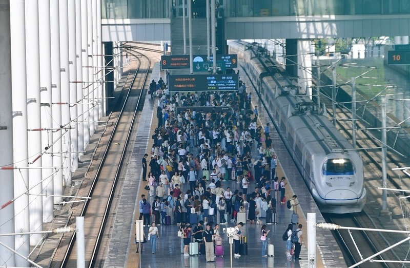 10月8日,旅客在江蘇無(wú)錫火車站站臺(tái)乘車。
