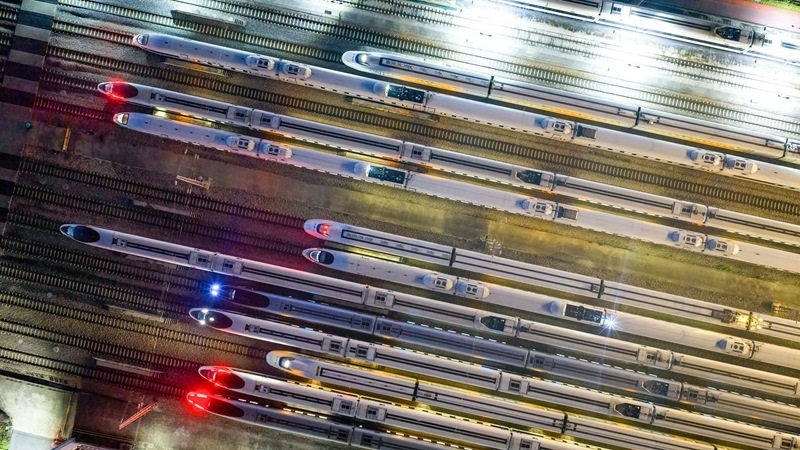 10月10日拍攝的停靠在南京動(dòng)車(chē)段南京南動(dòng)車(chē)運(yùn)用所存車(chē)線上的列車(chē)(無(wú)人機(jī)照片)。
