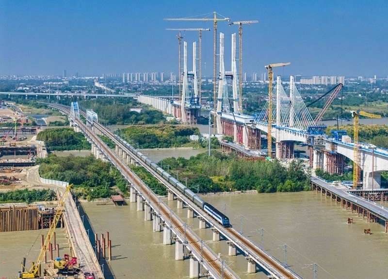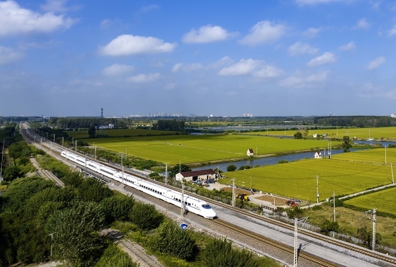 10月10日,列車(chē)行駛在寧啟鐵路江蘇揚(yáng)州段(無(wú)人機(jī)照片)。