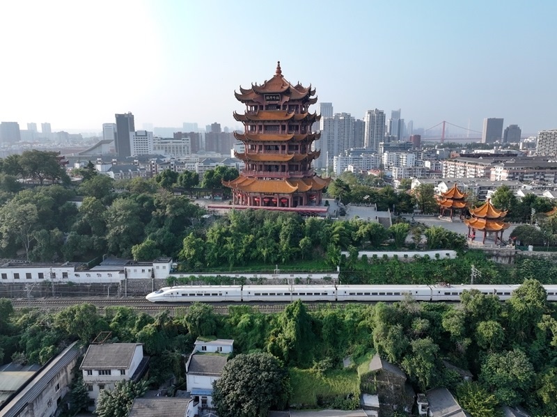 10月10日,動(dòng)車(chē)組列車(chē)經(jīng)過(guò)湖北省武漢市黃鶴樓(無(wú)人機(jī)照片)。