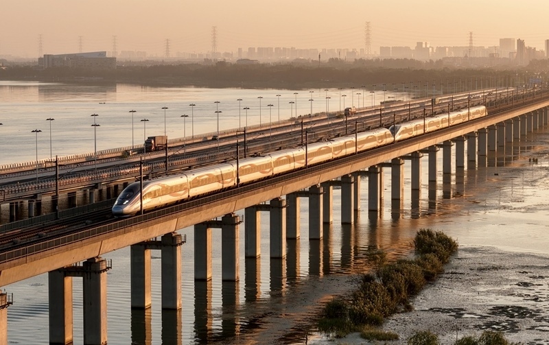 10月10日,在江蘇省昆山市,動(dòng)車(chē)組列車(chē)通過(guò)京滬高鐵丹昆特大橋陽(yáng)澄湖段(無(wú)人機(jī)照片)。