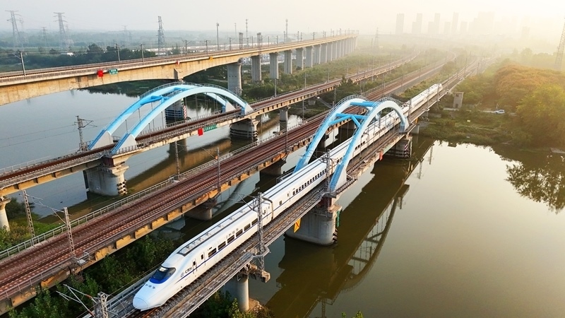 10月10日在江蘇南京拍攝的行駛中的動(dòng)車(chē)組列車(chē)(無(wú)人機(jī)照片)。