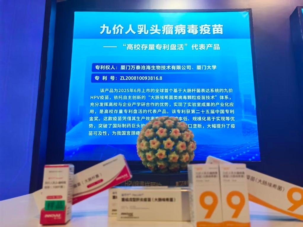 在第十四屆中國(guó)國(guó)際專(zhuān)利技術(shù)與產(chǎn)品交易會(huì)上展出的九價(jià)人乳頭瘤病毒疫苗。新華社記者徐鵬航 攝