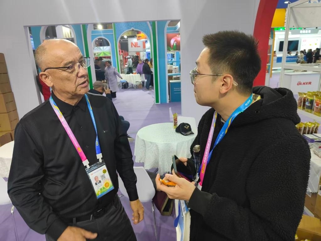 2025年10月24日,塔吉克斯坦杏和公司負責人普洛特·阿舒羅夫(左)介紹自己參加第32屆中國楊凌農(nóng)業(yè)高新科技成果博覽會的相關(guān)情況。新華社記者 姚友明 攝