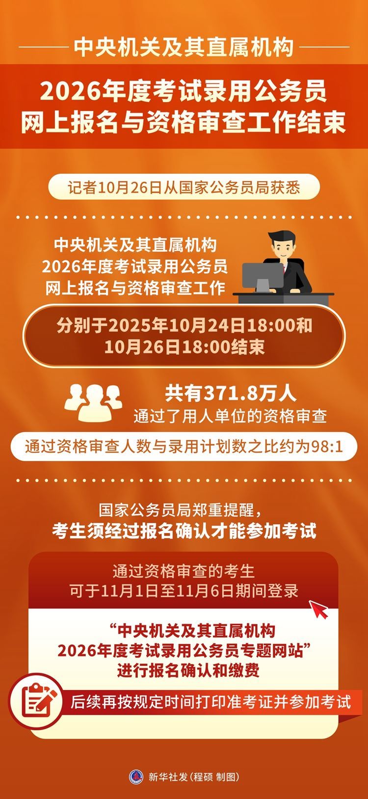 國家公務(wù)員局鄭重提醒,考生須經(jīng)過報(bào)名確認(rèn)才能參加考試。通過資格審查的考生可于11月1日至11月6日期間,登錄“中央機(jī)關(guān)及其直屬機(jī)構(gòu)2026年度考試錄用公務(wù)員專題網(wǎng)站”進(jìn)行報(bào)名確認(rèn)和繳費(fèi),后續(xù)再按規(guī)定時(shí)間打印準(zhǔn)考證并參加考試。