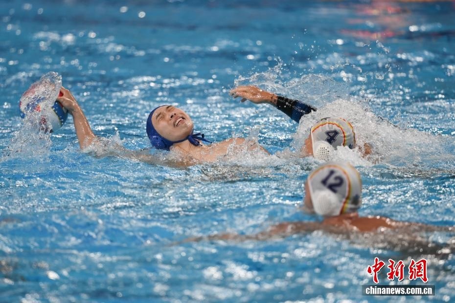 10月27日晚,在廣東廣州舉行的第十五屆全國(guó)運(yùn)動(dòng)會(huì)水球男子組比賽金牌賽中,廣東隊(duì)(藍(lán)帽)以16比9戰(zhàn)勝上海隊(duì)(白帽),獲得金牌。圖為上海隊(duì)運(yùn)動(dòng)員王貝易(中)和廣東隊(duì)運(yùn)動(dòng)員譚恒業(yè)(右)在比賽中拼搶。