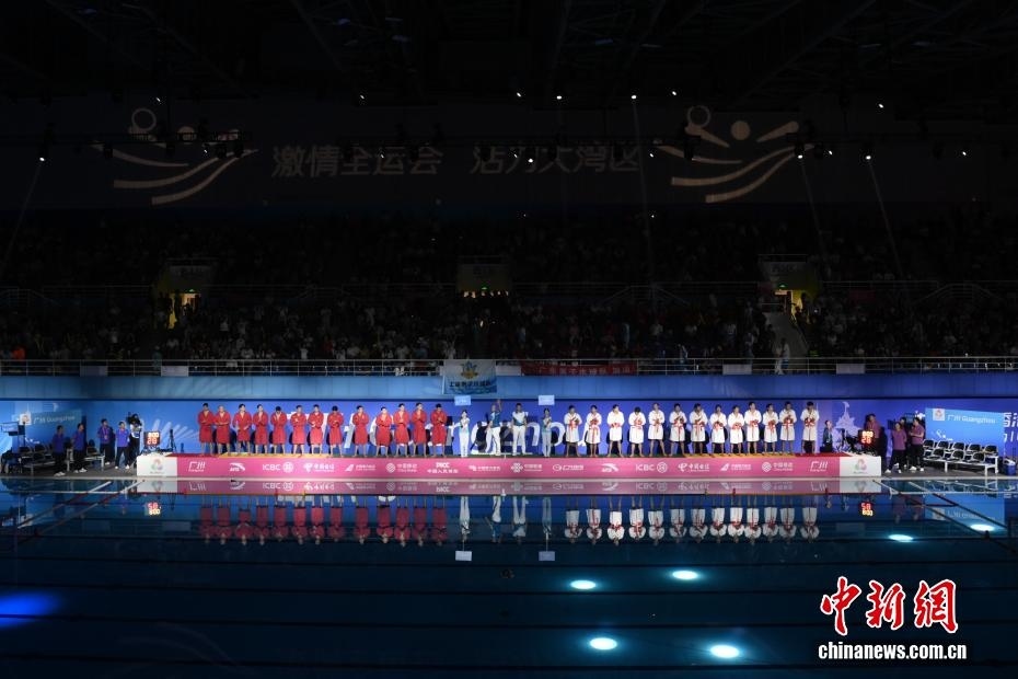 10月27日晚,在廣東廣州舉行的第十五屆全國(guó)運(yùn)動(dòng)會(huì)水球男子組比賽金牌賽中,廣東隊(duì)(紅衣)以16比9戰(zhàn)勝上海隊(duì)(白衣),獲得金牌。圖為雙方運(yùn)動(dòng)員出場(chǎng)。