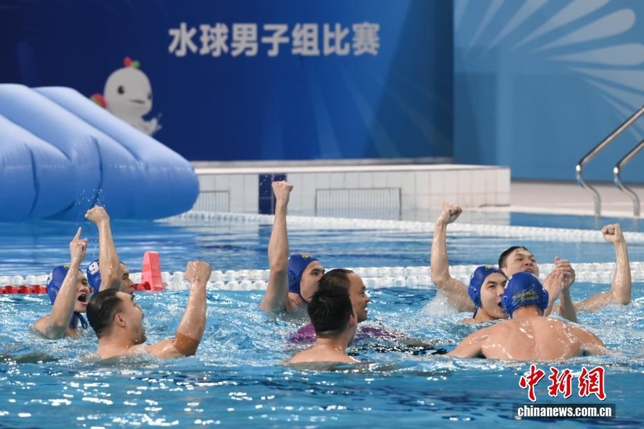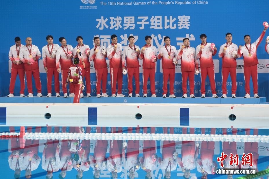 10月27日晚,在廣東廣州舉行的第十五屆全國(guó)運(yùn)動(dòng)會(huì)水球男子組比賽金牌賽中,廣東隊(duì)以16比9戰(zhàn)勝上海隊(duì),獲得金牌。圖為廣東隊(duì)?wèi)c祝比賽獲勝。
