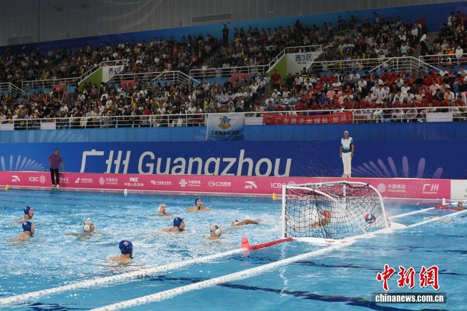 10月27日晚,在廣東廣州舉行的第十五屆全國(guó)運(yùn)動(dòng)會(huì)水球男子組比賽金牌賽中,廣東隊(duì)以16比9戰(zhàn)勝上海隊(duì),獲得金牌。圖為廣東隊(duì)運(yùn)動(dòng)員解澤楷(藍(lán)帽)在比賽中進(jìn)攻。