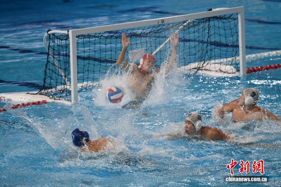 10月27日晚,在廣東廣州舉行的第十五屆全國(guó)運(yùn)動(dòng)會(huì)水球男子組比賽金牌賽中,廣東隊(duì)以16比9戰(zhàn)勝上海隊(duì),獲得金牌。圖為上海隊(duì)11號(hào)運(yùn)動(dòng)員蔡宇浩(白帽)在比賽中進(jìn)攻。