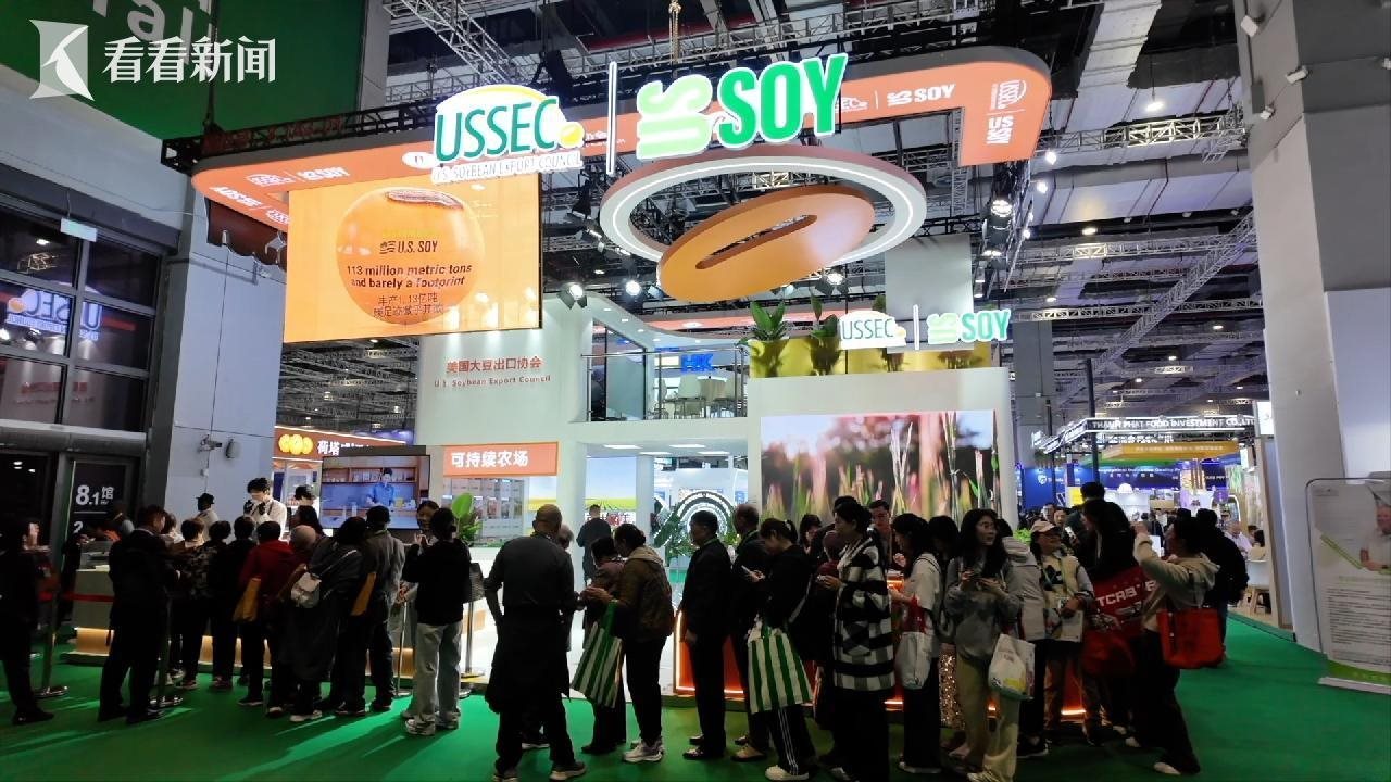 蘇健說的不是客套話。進博會一開始,他的行程就滿滿當當——開館剪彩、客商對接、媒體專訪。他的身后,是一群帶著中文名片、中文宣傳資料的豆農(nóng),賣力帶貨?!罢绱蠹以诂F(xiàn)場看到的,我們可以把大豆加工成大豆油,這種油品更適合高溫烹飪?!泵绹罐r(nóng)蓋思凱說。