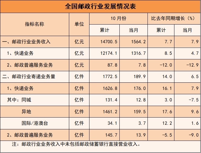 10月份,郵政行業(yè)寄遞業(yè)務(wù)量完成189.9億件,同比增長6.5%。其中,快遞業(yè)務(wù)量完成176.0億件,同比增長7.9%。