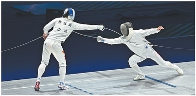 運(yùn)動員在十五運(yùn)會擊劍項(xiàng)目男子重劍個人決賽中。本報(bào)記者 王 亮攝