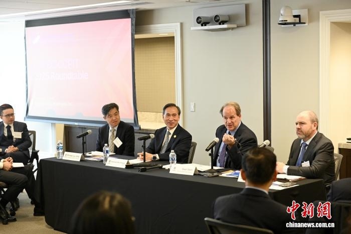 當(dāng)?shù)貢r(shí)間12月3日,華盛頓,中國(guó)貿(mào)促會(huì)組織中國(guó)企業(yè)家代表團(tuán)與美中貿(mào)易全國(guó)委員會(huì)及其會(huì)員企業(yè)交流座談。中新社記者 陳孟統(tǒng) 攝