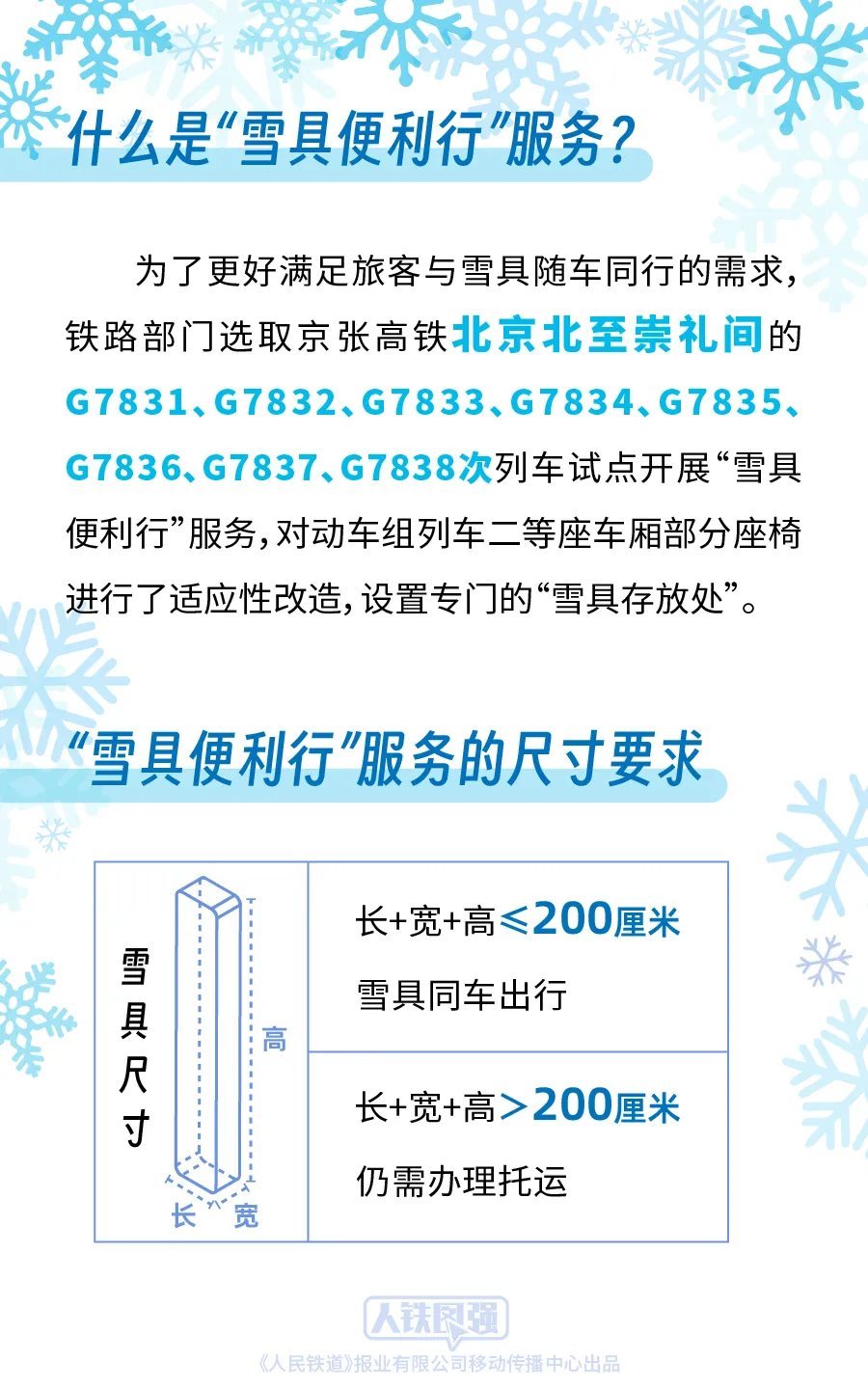 鐵路部門堅(jiān)持以人民為中心的發(fā)展思想,持續(xù)深化運(yùn)輸供給側(cè)結(jié)構(gòu)性改革,積極適應(yīng)旅客多樣化的出行需求,為攜帶雪具出行的旅客提供便捷服務(wù)。前期,鐵路部門按照《國(guó)鐵集團(tuán)鐵路旅客運(yùn)輸規(guī)程》“旅客乘坐動(dòng)車組列車隨身攜帶的行李物品長(zhǎng)、寬、高之和不超過130厘米”的規(guī)定,對(duì)超過上述尺寸標(biāo)準(zhǔn)的雪具推出了“雪具快運(yùn)”服務(wù)。為了更好滿足旅客與雪具隨車同行的需求,鐵路部門統(tǒng)籌考慮旅客安全、乘車秩序和雪具運(yùn)輸需求,選取京張高鐵北京北至崇禮間的G7831、G7832、G7833、G7834、G7835、G7836、G7837、G7838次列車試點(diǎn)開展“雪具便利行”服務(wù),對(duì)動(dòng)車組列車二等座車廂部分座椅進(jìn)行了適應(yīng)性改造,設(shè)置專門的“雪具存放處”,旅客選擇該服務(wù)后可攜帶長(zhǎng)、寬、高之和不超過200厘米的雪具同車出行,滑雪更加方便快捷。對(duì)于長(zhǎng)、寬、高之和超過200厘米的雪具,由于高鐵列車車內(nèi)空間限制,仍需辦理托運(yùn)。