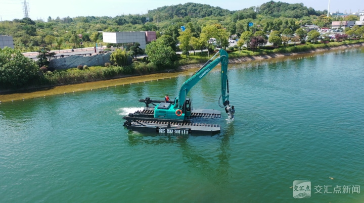 只見一臺(tái)身披“山河綠”的水陸兩棲挖掘機(jī)穩(wěn)穩(wěn)地在水中行駛。駕駛室里的工程師輕拉搖桿,這個(gè)足有兩層樓高的“鋼鐵巨獸”便靈活轉(zhuǎn)身,履帶劃過(guò)水面,泛起層層漣漪——輕巧的身姿完全顛覆了人們對(duì)挖掘機(jī)“只能在地上笨重行走”的固有印象。