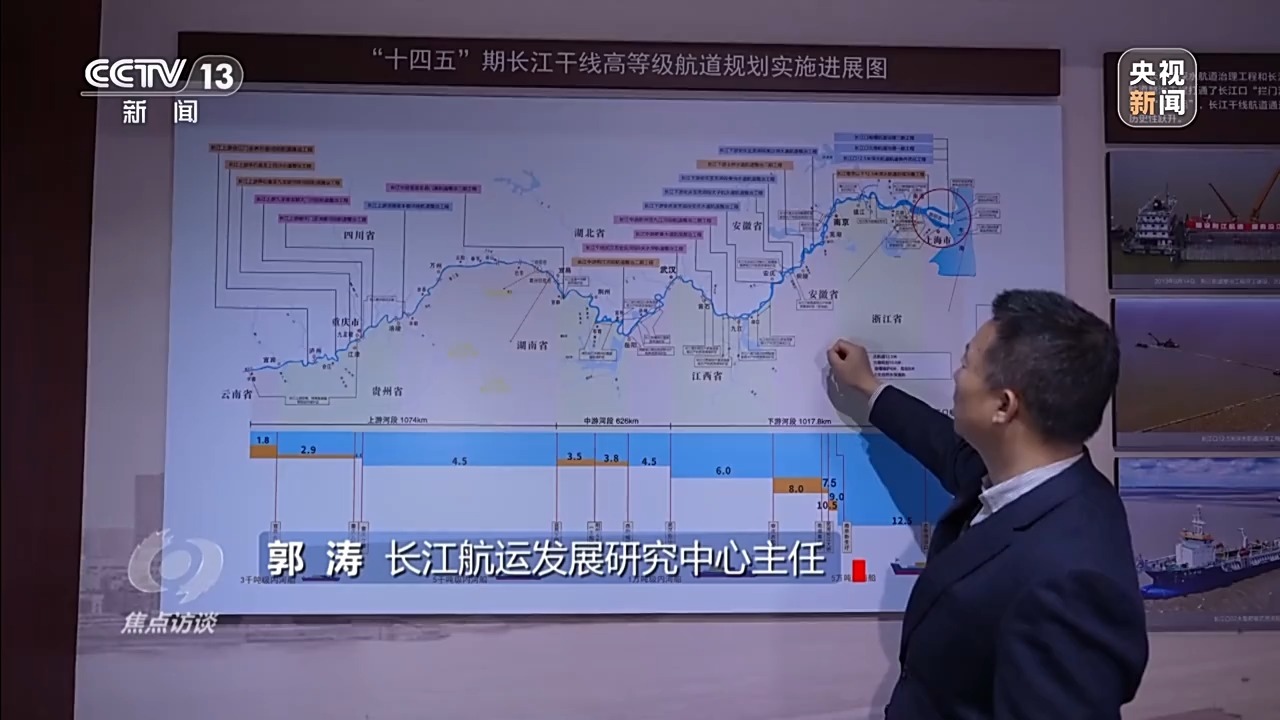 郭濤:十年前,因為局部的堵點卡點,航道標準不能統(tǒng)一,水深沒法貫通起來。通過十年的整治和疏浚,水深明顯提升了,可以通航的船舶更大了,物流成本就更低了。