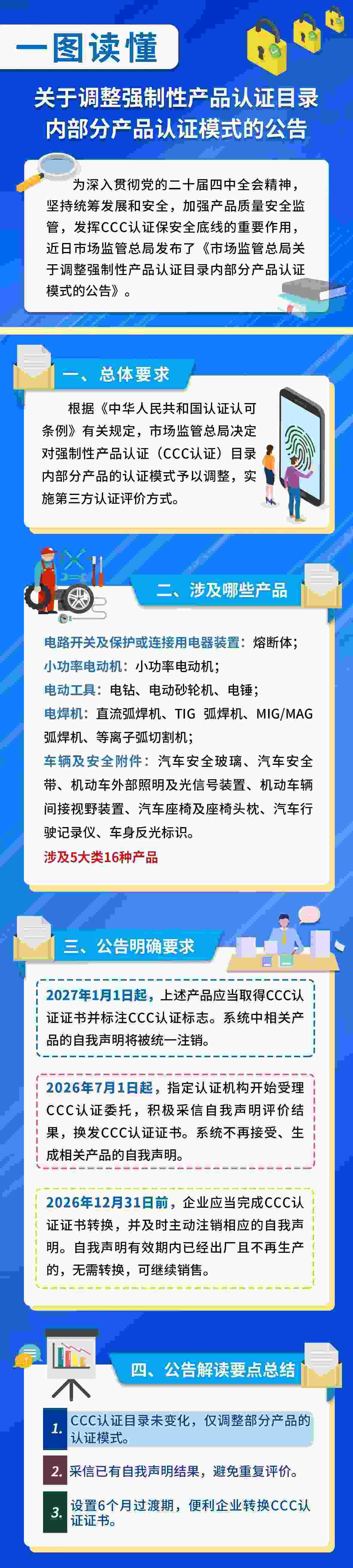 《公告》明確,電動工具、汽車安全部件等16種涉及群眾人身健康安全的產(chǎn)品,CCC認(rèn)證模式由之前的企業(yè)自我聲明調(diào)整為第三方認(rèn)證評價方式。