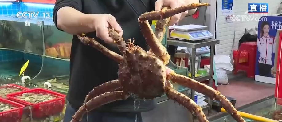 走進(jìn)“八市”,就像走進(jìn)了一個活生生的“海鮮大觀園”。這些是市場里的“重量級選手”,這只帝王蟹張牙舞爪、個頭碩大,掂量一下,單個的重量就有好幾斤。旁邊的這個是波士頓大龍蝦,是宴請餐桌上的一道“硬菜”。這種在本地叫作“富貴蝦”,大小不一,這只已經(jīng)和我的手腕差不多粗了。