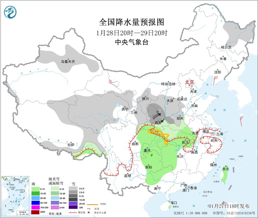 圖1 全國降水量預(yù)報(bào)圖(1月27日20時(shí)-28日20時(shí))