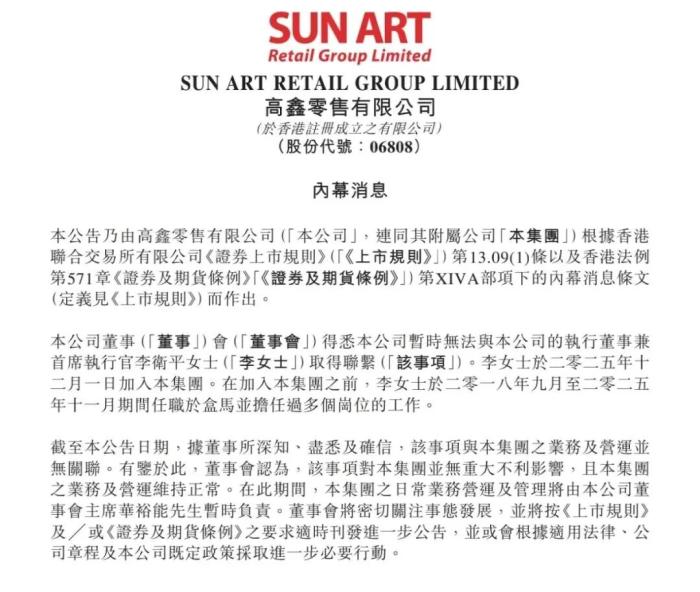 2月4日,大潤(rùn)發(fā)母公司高鑫零售在港交所發(fā)布公告稱,公司暫時(shí)無法與執(zhí)行董事兼首席執(zhí)行官李衛(wèi)平取得聯(lián)系。