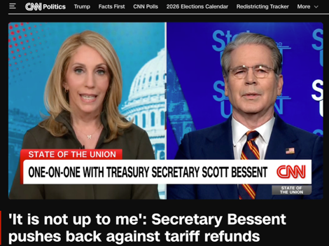 貝森特當(dāng)天在CNN接受采訪時(shí)強(qiáng)調(diào)兩點(diǎn):第一,最高法院對(duì)總統(tǒng)依據(jù)IEEPA征收關(guān)稅的權(quán)力做了“非常狹義”的解讀,但并沒(méi)有涉及退款問(wèn)題;第二,案件已發(fā)回下級(jí)法院,因此退款“不是政府決定,而是由下級(jí)法院決定”。 如果只看字面,這兩句話都有一定真實(shí)性,但若看整體效果,卻更像是一場(chǎng)有技巧的責(zé)任轉(zhuǎn)移。