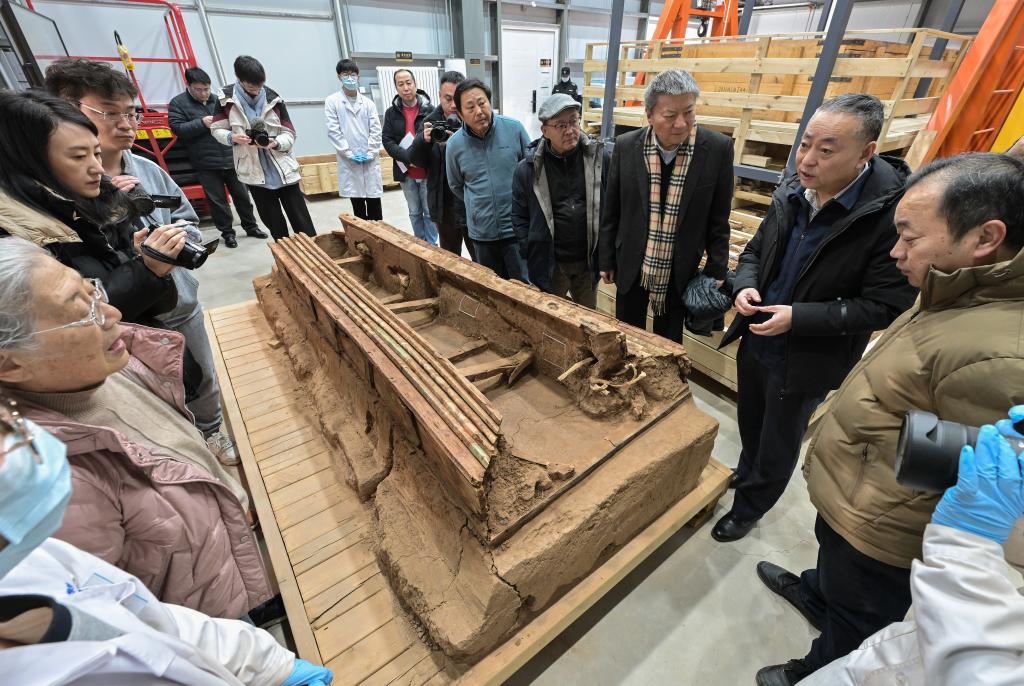 巴達(dá)木東晉唐時期墓群考古發(fā)掘負(fù)責(zé)人尚玉平(右二)向?qū)<覀兘榻B墓葬M20出土的彩繪木棺座。新華社記者 李賀 攝