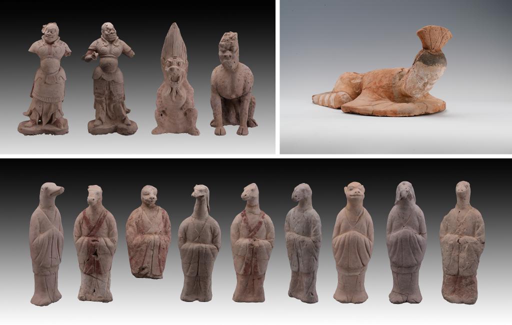 拼版照片:新疆吐魯番市巴達(dá)木東晉唐時期墓群出土的陶俑(資料照片)。新華社 發(fā)