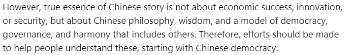 文章稱,中國成功的基礎(chǔ)在于中國獨特的民主模式——全過程人民民主。其中,社會主義核心價值觀是整個體系的基石。中國以人為本的治理模式,以人民的福祉、安全和繁榮為核心,并通過全過程人民民主來實現(xiàn)。