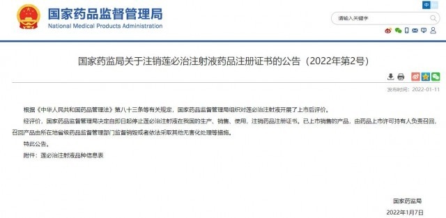國(guó)家藥監(jiān)局:自即日起停止蓮必治注射液在我國(guó)的生產(chǎn)、銷(xiāo)售、使用
