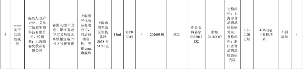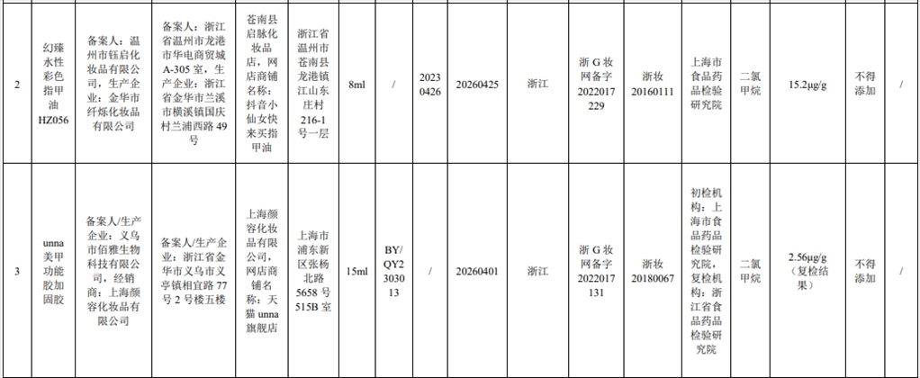 根據(jù)通告,在2023年國家化妝品抽樣檢驗工作中,經(jīng)上海市食品藥品檢驗研究院等單位檢驗,產(chǎn)品標簽標示委托方為溫州市鈺啟化妝品有限公司、受托生產(chǎn)企業(yè)為金華市纖爍化妝品有限公司生產(chǎn)的幻臻水性彩色指甲油HZ088等7批次化妝品不符合規(guī)定,檢出《化妝品安全技術(shù)規(guī)范(2015年版)》中規(guī)定的禁用原料。