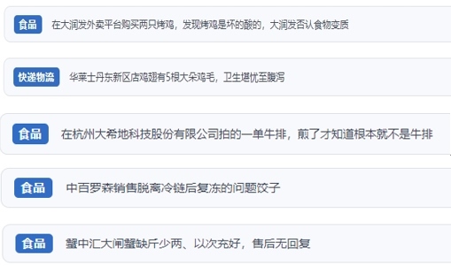 “人民投訴”上不少網友反映,“外賣商家銷售排骨套餐中含過期飲料”“外賣店鋪吃出蟑螂,商家不按照食品安全法賠償” “直播間購買車厘子,虛假宣傳3J、原裝進口,到貨嚴重貨不對板”“網購東北珍珠貢米,到貨包裝上執(zhí)行標準是廢止的標準”“超市買的梅花肉切開發(fā)現是淋巴肉”“平臺商家承諾枸杞不熏硫酸,實則檢測后含硫超標”“知名便利店售賣脫離冷鏈后多次復凍的餃子”等。