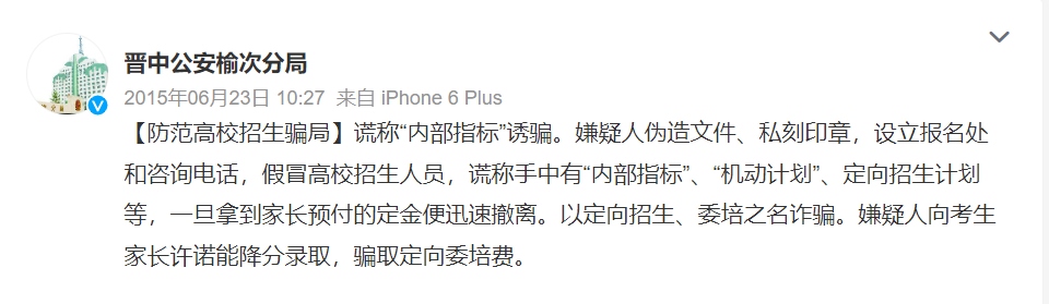 每年各省市投檔分?jǐn)?shù)線公布后,總是“幾家歡喜幾家愁”,不法分子也在此刻瞄準(zhǔn)了落榜考生。根據(jù)各地公安部門通報,一些不法分子假冒高校招生人員或聲稱“熟悉”高校招生辦,點對點與相關(guān)考生取得聯(lián)系。隨后謊稱有某高校的“內(nèi)部指標(biāo)”“機動計劃”,或是以“定向招生”“委培招生”等名義“降分錄取”考生,誘騙其繳納相關(guān)費用。需要注意的是,在實施這些詐騙行為時,不法分子往往使用電腦合成技術(shù)偽造“招生文件”“學(xué)校公章”等,騙取考生及家長的信任。