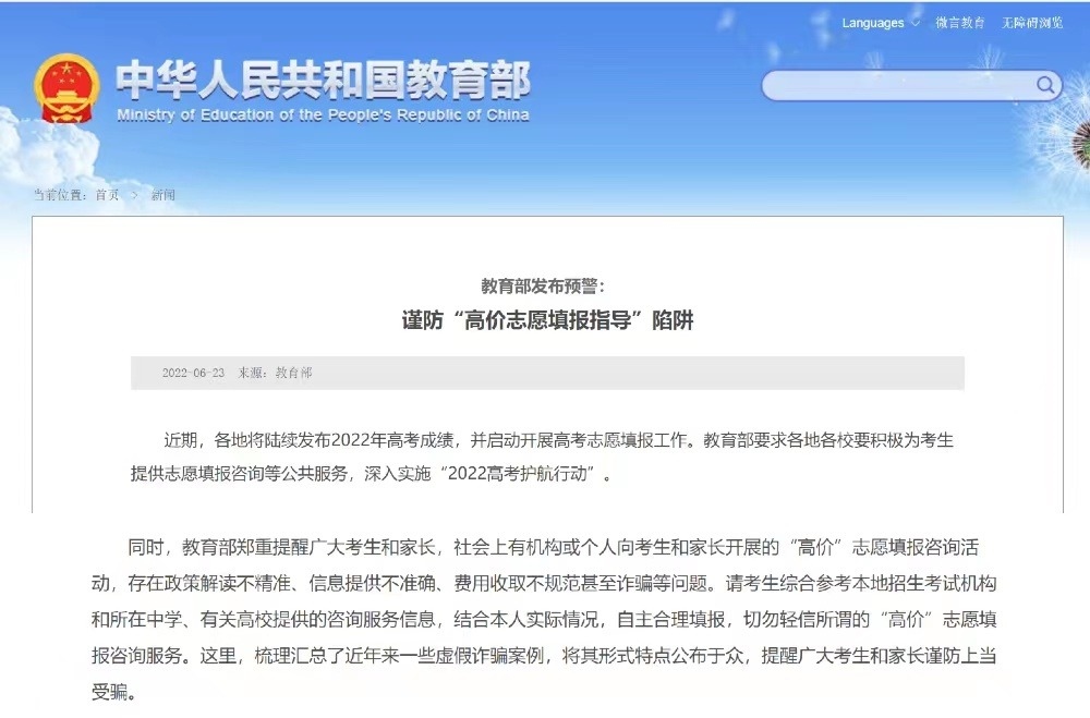 近日,教育部發(fā)布預(yù)警,提醒考生謹(jǐn)防“高價志愿填報指導(dǎo)”陷阱。有網(wǎng)站虛假宣傳擁有所謂“內(nèi)部信息”,自稱掌握內(nèi)部大數(shù)據(jù),能夠“精準(zhǔn)定位院校”等等。事實上,每年高考填報志愿前,各省級招生考試機構(gòu)都會發(fā)布當(dāng)年高考成績統(tǒng)計情況和近年來各高校錄取分?jǐn)?shù)情況,并不存在市面上的咨詢機構(gòu)或個人聲稱的“內(nèi)部信息”。還有一些咨詢機構(gòu)假冒所謂志愿填報專家身份。該咨詢機構(gòu)打出廣告,稱團隊的專家“獲得高考志愿規(guī)劃師認(rèn)證”“來自著名高?!钡?。事實上,有關(guān)部門從未發(fā)放過“高考志愿規(guī)劃師”這類職業(yè)資格證書。該機構(gòu)一些所謂“志愿規(guī)劃師”都是臨時招募的社會人員,按照總部提供的“臺詞”給考生和家長輔導(dǎo)。家長購買這些機構(gòu)的服務(wù)不僅花了冤枉錢,而且可能報錯志愿。
