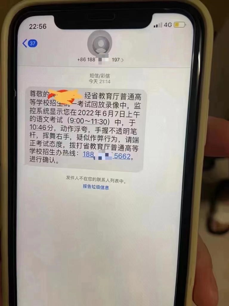“尊敬的考生×××,經(jīng)省教育廳普通高等學(xué)校招生統(tǒng)一考試回放錄像中,監(jiān)控系統(tǒng)顯示您在2022年6月7日上午的語文考試(9:00—11:30)中,于10時46分,動作浮夸,手握不透明筆桿,揮舞右手,疑似作弊行為,請端正考試態(tài)度,撥打省教育廳普通高等學(xué)校招生辦熱線:188×××進行確認(rèn)?!苯?,有考生向廈門警方反映,自己接到了聲稱是“省教育廳普通高等學(xué)校招生辦”的通知短信,懷疑是詐騙信息。該短信在開頭準(zhǔn)確寫明了考生姓名,并在結(jié)尾要求考生主動撥電話號碼進行確認(rèn)。經(jīng)與教育部門核實確認(rèn),高考作弊違規(guī)行為不會以短信、電話、鏈接等方式通知。廈門警方提醒,不法分子通過非正常渠道搜集到考生信息,并向考生發(fā)送所謂“疑似作弊”的通知短信,考生一旦回撥電話,就可能被不法分子以“處理作弊行為”為由實施詐騙?! ?/p>