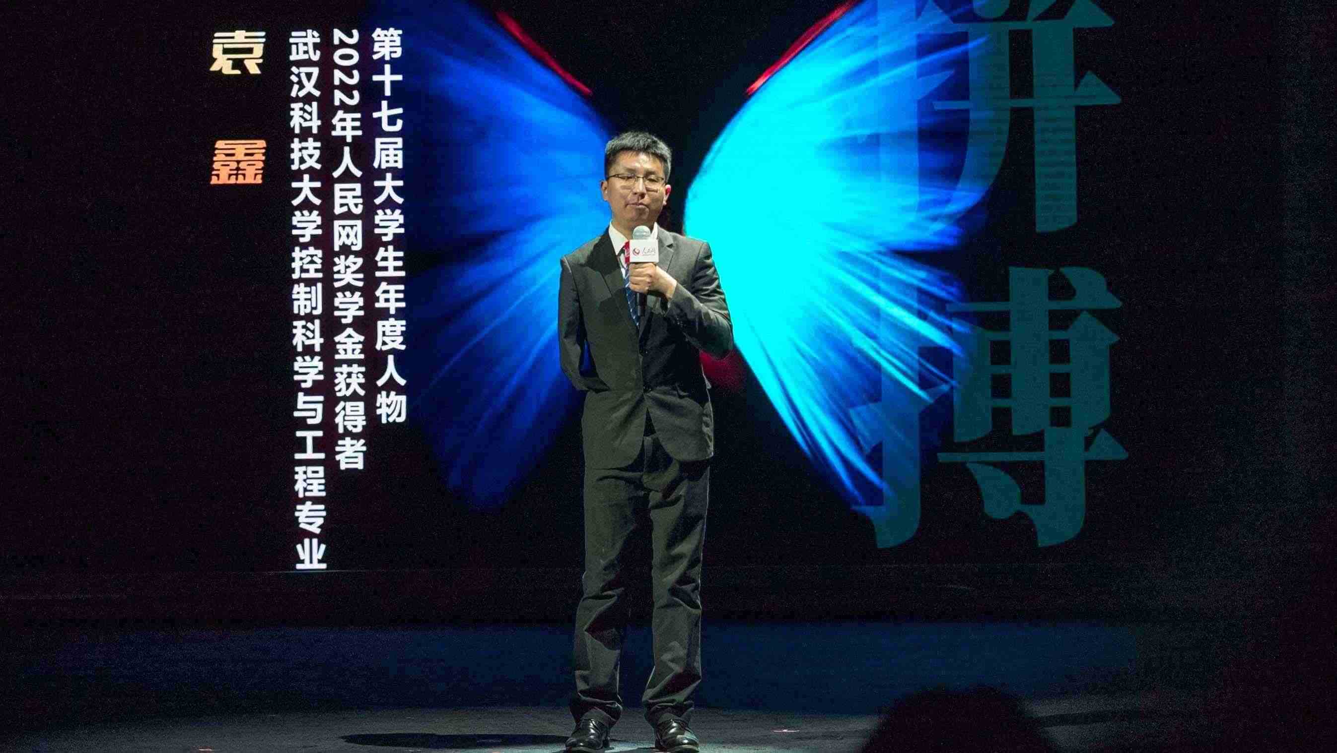 第十七屆大學(xué)生年度人物、2022年度人民網(wǎng)獎學(xué)金一等獎獲得者武漢科技大學(xué)控制科學(xué)與工程專業(yè)博士生袁鑫分享自己的故事。實習生韓華良 攝