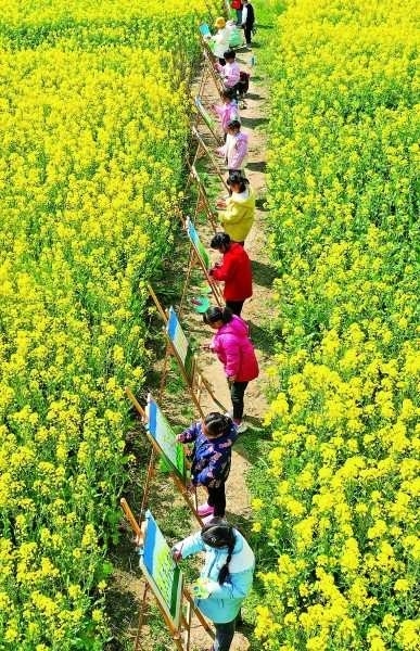江蘇如皋市下原鎮(zhèn)下原幼兒園小朋友在油菜花田間畫畫。徐慧攝/光明圖片