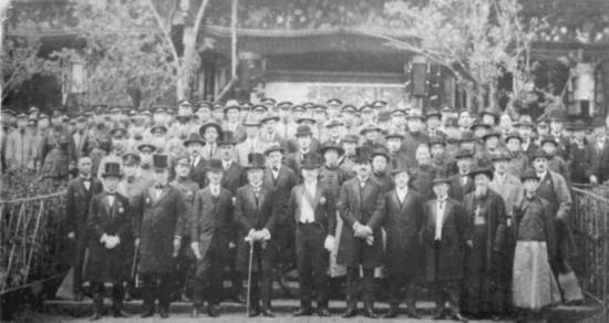 1923年4月20日,東陸大學(xué)隆重舉行新校舍奠基典禮暨大學(xué)開學(xué)典禮。奠基儀式后,唐繼堯(左5)、董澤(左1)與英、美、法、日等國領(lǐng)事、河內(nèi)大學(xué)代表、省議會(huì)議長、航空處處長等政府官員合影。云南大學(xué)供圖