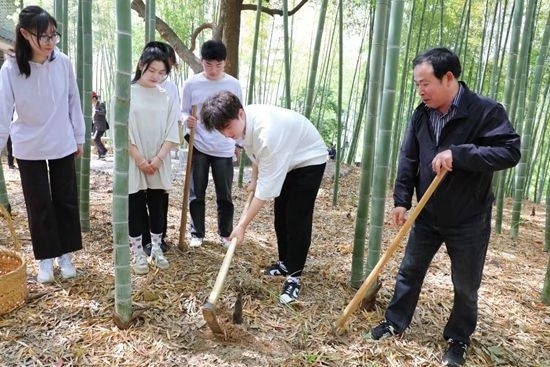 進行40分鐘的“漫談式”課程后,師生們一起拿起鋤頭,開始挖筍實踐。在勞動中,他們感受著春天的饋贈。該校視覺傳達與設(shè)計專業(yè)的南通姑娘周雨濛從未嘗試過挖筍。對于校園中的竹子是何人養(yǎng)護、怎么養(yǎng)護,她了解得不多。課堂上,她第一次拿起鋤頭,在學校校工的帶領(lǐng)下挖筍。