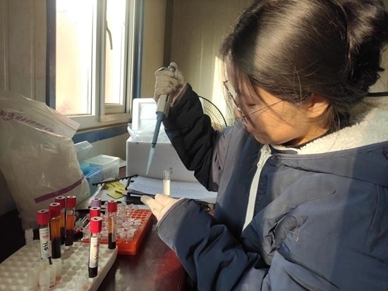 2月16日,2022級(jí)碩士研究生王慧莉把在科技小院所采的牛血液樣品做離心處理。圖片由受訪者提供