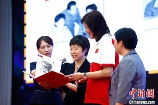 圖為郎平向陳經(jīng)綸中學(xué)贈(zèng)送紀(jì)念品。中新社記者 富田 攝