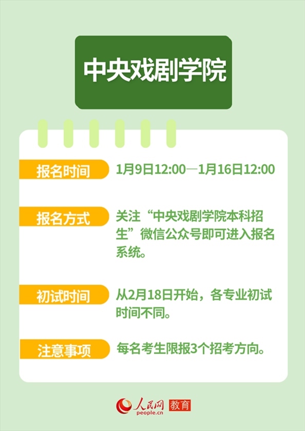 人民網(wǎng)北京1月12日電 近日,全國多所高校發(fā)布藝術(shù)類本科招生簡章,并明確藝考報名及初試時間。作為“新政”落地后的首次考試,2024年的“新藝考”備受關(guān)注。