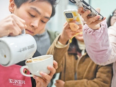 在武漢市硚口區(qū)古田坊一家咖啡店,教師戴輝演示咖啡拉花。