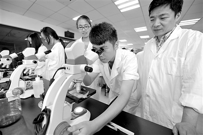 杭州職業(yè)技術(shù)學院生物制藥專業(yè)客座教授、杭州市首席技師章飛龍(右一)正在指導(dǎo)學生實訓(xùn)。