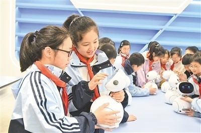 浙江省建德市明珠小學(xué)勵(lì)珠機(jī)器人社團(tuán)的學(xué)生在老師指導(dǎo)下,體驗(yàn)操作機(jī)器人。寧文武攝(人民圖片)