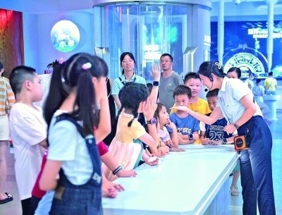 暑期,安徽省科技館在常設(shè)展覽之外開展研學(xué)營、科學(xué)課程、科學(xué)實(shí)驗(yàn)等科普活動,讓孩子們在豐富多彩的活動中感受科技魅力。圖為7月10日,工作人員與參加研學(xué)營的小朋友互動。(新華社記者 傅天攝)