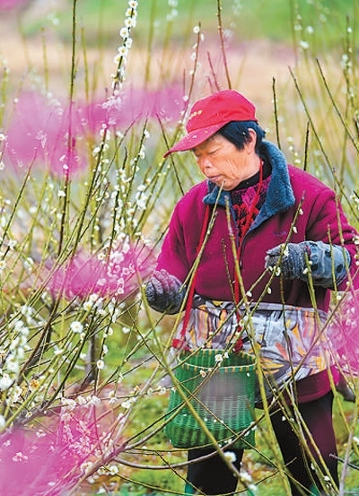 浙江省湖州市長興縣龍山街道的東方梅園內,梅農正在采摘梅花,用于制作梅花香水、梅花精油等產品。