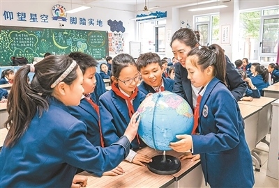 圖為老師帶領(lǐng)學(xué)生通過地球儀了解地球。