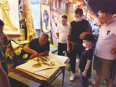 在老街上一些具有民族特色的皮畫店、皮包店也成為了人們駐足消費、觀賞的熱點商鋪。在一家皮畫店,皮畫師在現(xiàn)場制作皮畫,看著精美的圖案被皮畫師一筆一筆地勾勒出來,不少市民都忍不住停下腳步。“帶孩子出來閑逛,看到皮畫孩子主動提出來要看,皮畫是咱們呼市特有的,現(xiàn)場制作,能讓更多人了解制作過程,了解皮畫,挺好的?!笔忻裰芟壬f。