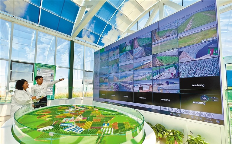 近日,巴彥淖爾市杭錦后旗二道橋鎮(zhèn)鄉(xiāng)村振興設(shè)施農(nóng)業(yè)產(chǎn)業(yè)園區(qū)工作人員正在記錄現(xiàn)代農(nóng)業(yè)數(shù)字平臺(tái)監(jiān)測(cè)數(shù)據(jù)。據(jù)悉,該園區(qū)占地2000畝,投資4600萬元,是集智慧農(nóng)業(yè)管理、引黃滴灌示范、集中連片種植等多項(xiàng)功能為一體的現(xiàn)代農(nóng)業(yè)產(chǎn)業(yè)園區(qū)。通過現(xiàn)代農(nóng)業(yè)數(shù)字平臺(tái),進(jìn)行智能管控、農(nóng)產(chǎn)品質(zhì)量檢測(cè)、科技培訓(xùn)、遠(yuǎn)程科技指導(dǎo),同時(shí)讓更多的農(nóng)戶利用APP與平臺(tái)共享數(shù)據(jù)資源,實(shí)現(xiàn)田間自動(dòng)化管理。園區(qū)通過平臺(tái)智能管控,今年第一茬種植麒麟西瓜,第二茬計(jì)劃種植葉菜類,兩茬畝均效益預(yù)計(jì)在2萬元以上。(記者 孟和朝魯 攝影報(bào)道)